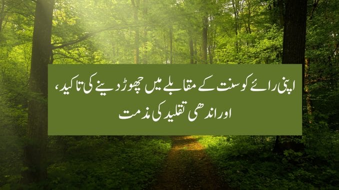 لہٰذا اس بات پر غور کرو یہ ایک جملہ ہی اندھی تقلید کو جڑ سے ختم کرنے کے لیے کافی ہے۔ اسی وجہ سے جب میں نے ایک مقلد شیخ کو اس بات پر تنبیہ کی کہ وہ امام ابو حنیفہ رحمہ اللہ کے قول پر فتویٰ دیتا ہے بغیر ان کی دلیل جانے، تو اس نے ان اقوال کی نسبت امام ابو حنیفہ رحمہ اللہ کی طرف ماننے سے ہی انکار کر دیا۔