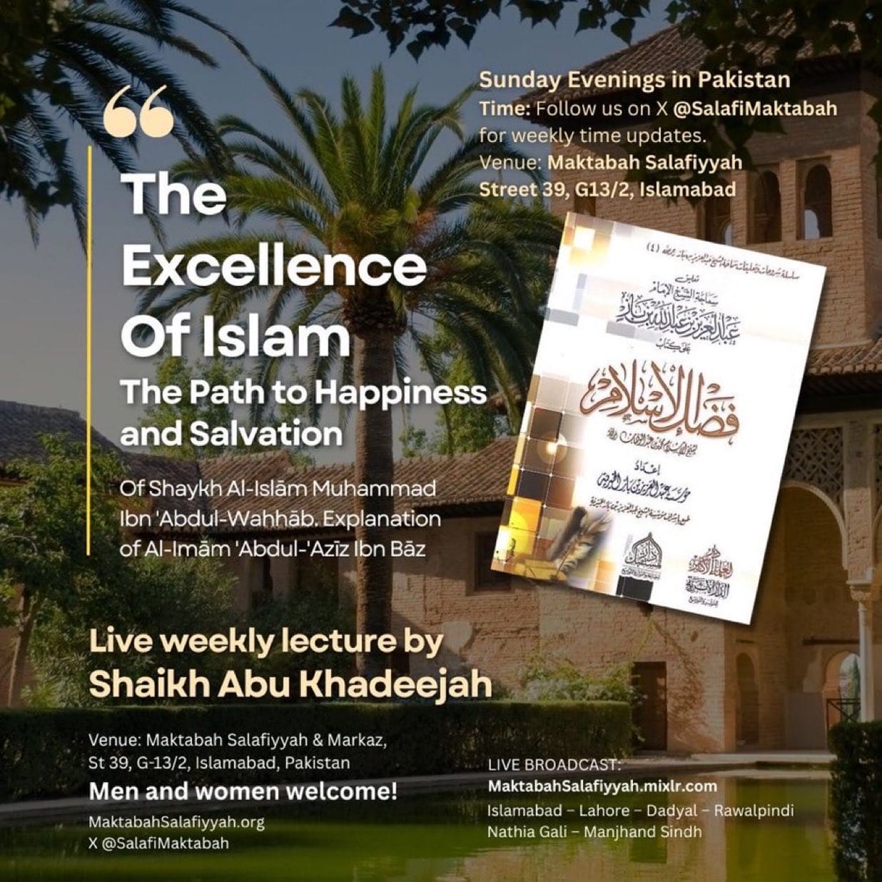 Audio: Playlist for Explanation of “Fadlul-Islam” (Excellence of Islam)—Taught by Shaikh Abu Khadeejah 24 November 2025 admin دروس Comments Off on Audio: Playlist for Explanation of “Fadlul-Islam” (Excellence of Islam)—Taught by Shaikh Abu Khadeejah Playlist for Explanation of “Fadl a-Islam” (Excellence of Islam) Book by Shaikh al-Islam Muhammad Ibn Abdul-Wahhāb. Explanation of Imam Abdul-Aziz Ibn Bāz. Additional comments by Abu Khadeejah Abdul-Wāhid. Makatabah Salafiyyah · Explanation Of Fadlul-Islam (The Excellence Of Islam) Of Shaikh Ibn Abdul-Wahhab by Abu Khadeejah 2025 abu khadeejah excellence of islam fadlul-islam